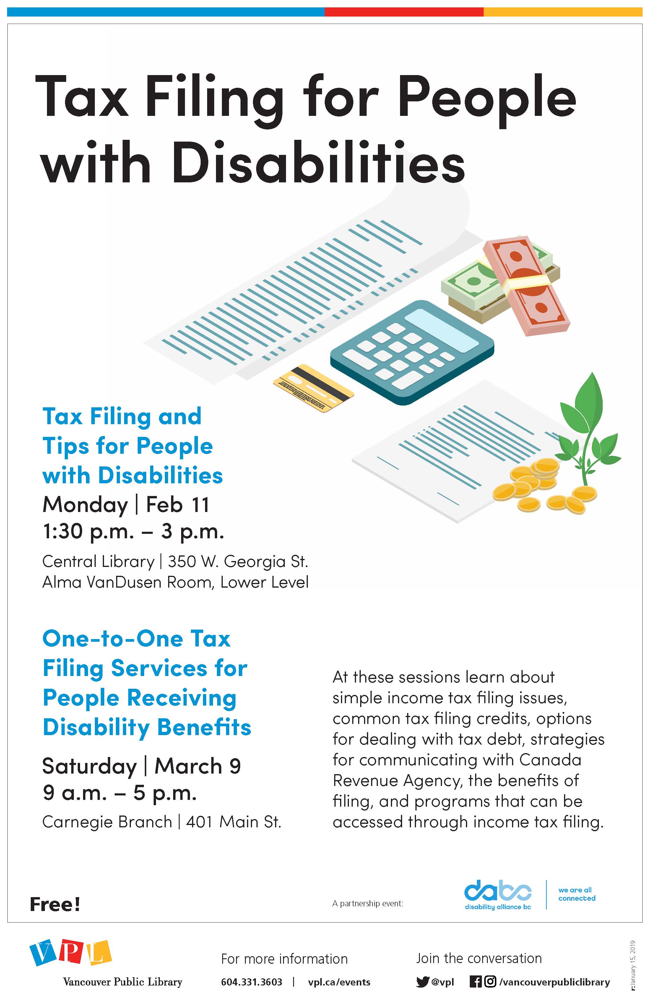 In partnership with Vancouver Public Library (VPL), Tax AID DABC is hosting workshops/tax filing sessions for people with disabilities: